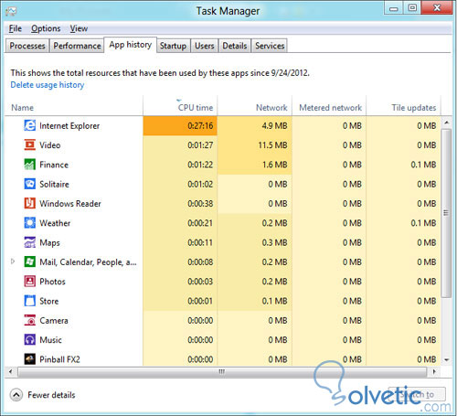 Una vez abierto podremos ver las distintas opciones que encontramos en versiones anteriores, sin embargo podemos destacar el App History, que nos da información de las aplicaciones a través del tiempo en cuanto a recursos utilizados por las mismas.