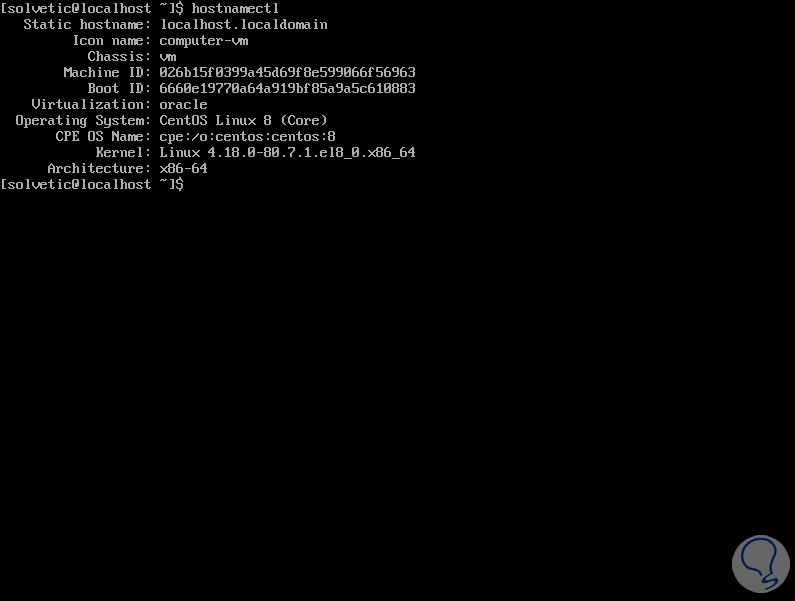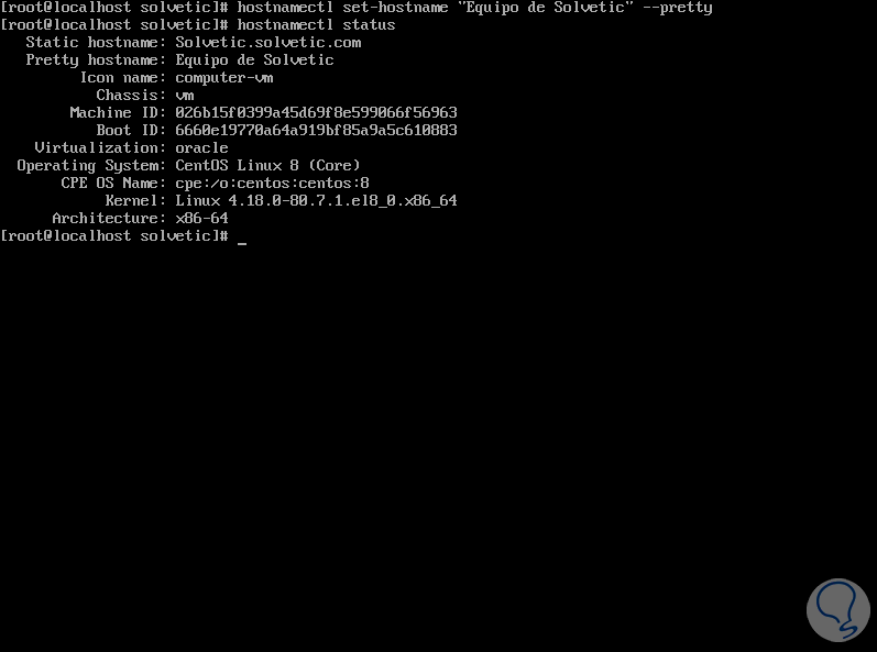 hostnamectl set-hostname "Equipo de Solvetic" –prettyComprobamos que se ha añadido la línea “Pretty hostname”: