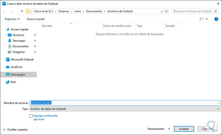 Se desplegará la siguiente ventana donde asignaremos el nombre del archivo .pst, nota que por defecto Outlook 2019 aloja este archivo en la ruta. Podemos cambiar esta ruta para un mejor acceso al archivo. Damos clic en Aceptar para guardar el archivo PST allí.