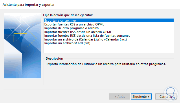 Damos clic en Siguiente y luego seleccionamos “Archivo de datos de Outlook (.pst):