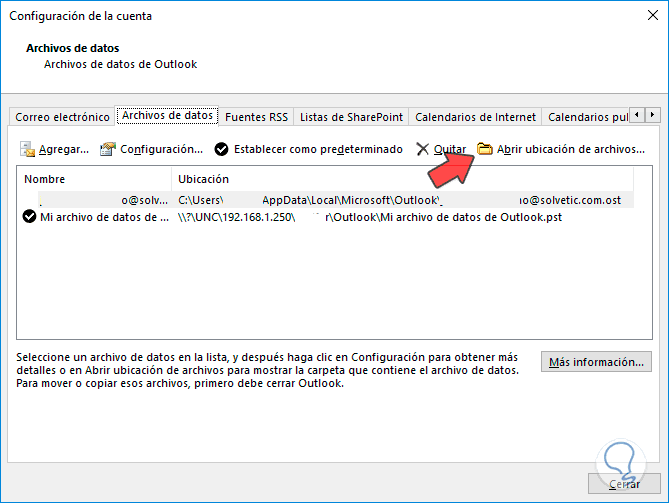Ahora vamos a la pestaña de “Archivo de datos” y pulsamos encima de nuestro archivo ost o pst y después en “Abrir ubicación de archivos”. Se te abrirá la ruta donde están almacenados. Ahora solo tenemos que cerrar Outlook y copiar en otra ubicación a buen recaudo nuestros datos.