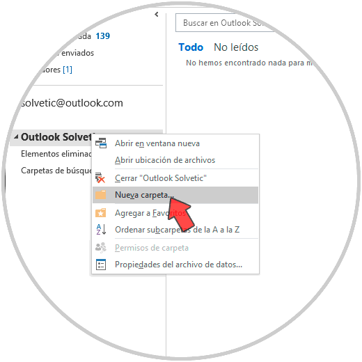Allí será posible crear carpetas para un control mucho más directo de los elementos del correo, para ello damos clic derecho sobre el nombre y seleccionamos “Nueva carpeta”: