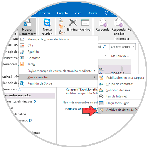 Para este proceso, abrimos Outlook e iremos al menú Inicio y allí, en el grupo Nuevo damos clic sobre la opción “Más elementos” y luego seleccionamos “Archivo de datos de Outlook”: