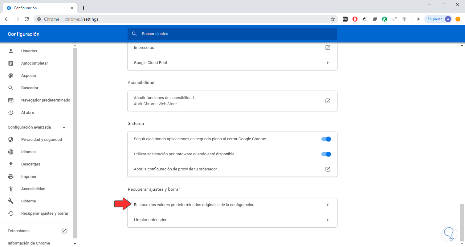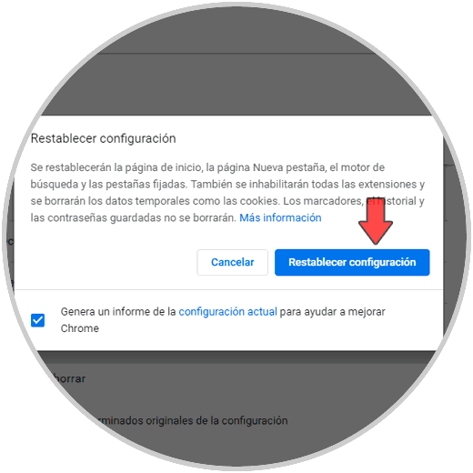En la nueva ventana damos clic sobre “Restablecer configuración”: