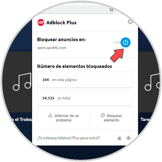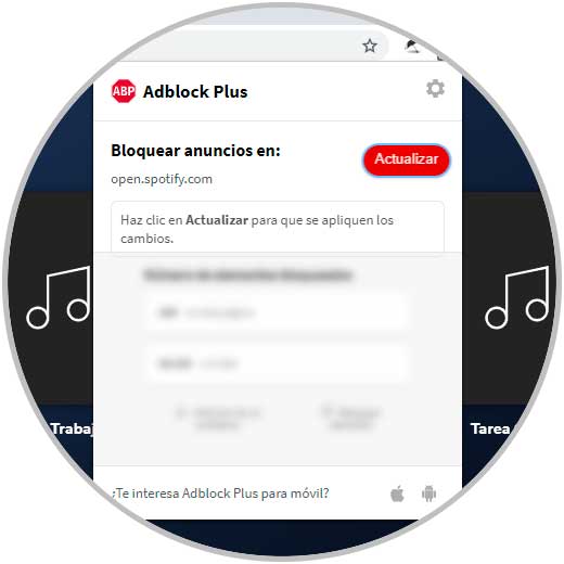 Es normal en estos días el uso de AdBlocker para evitar el despliegue de banners y anuncios molestos, pero ello puede afectar la reproducción de Spotify. Para esta configuración vamos a la pestaña donde tenemos abierto el reproductor y damos clic sobre la extensión AdBlocker y veremos lo siguiente: