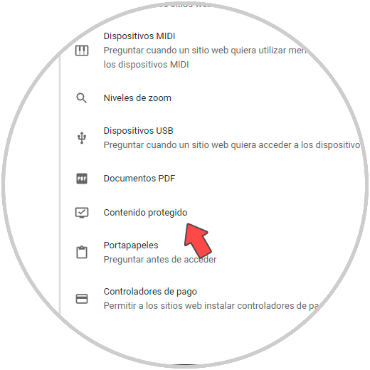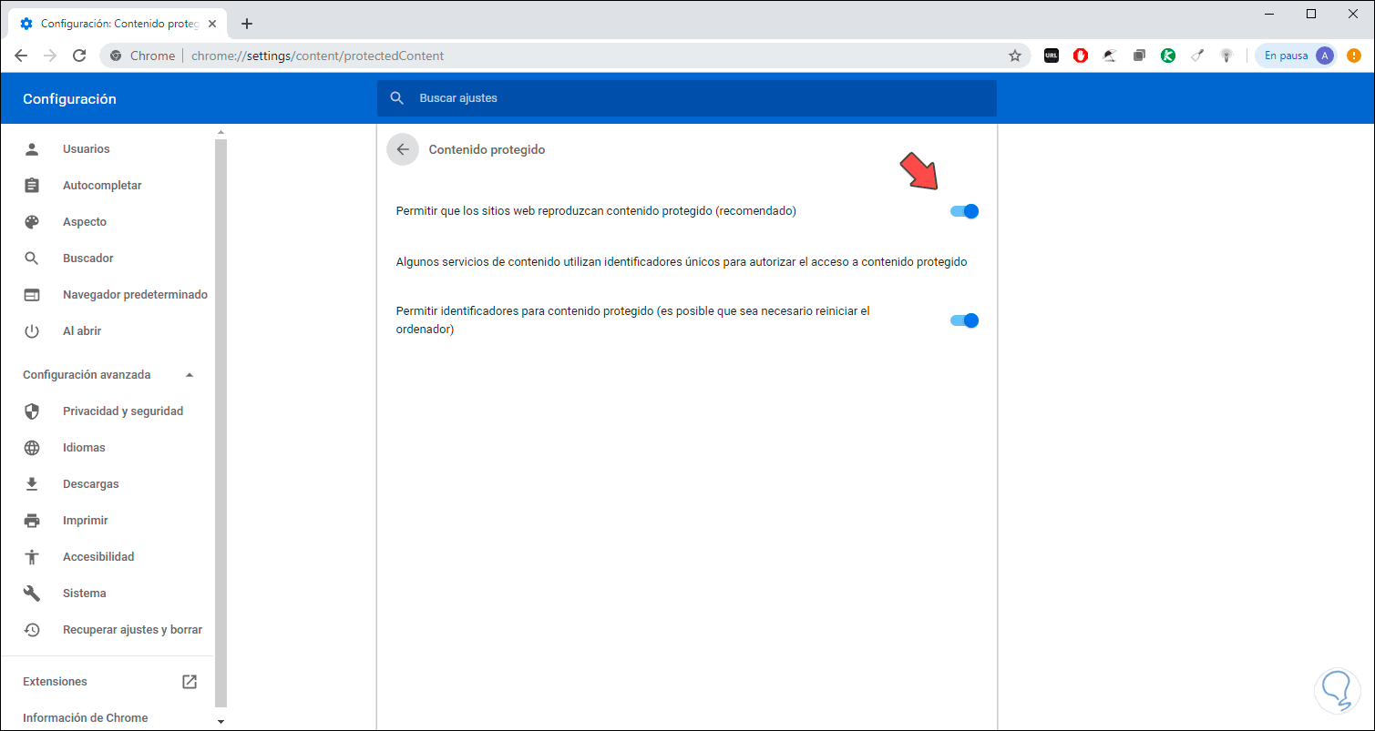 Damos clic sobre esa opción y activar los interruptores “Permitir que los sitios web reproduzcan contenido protegido” y “Permitir identificadores para contenido protegido”: