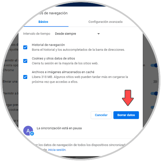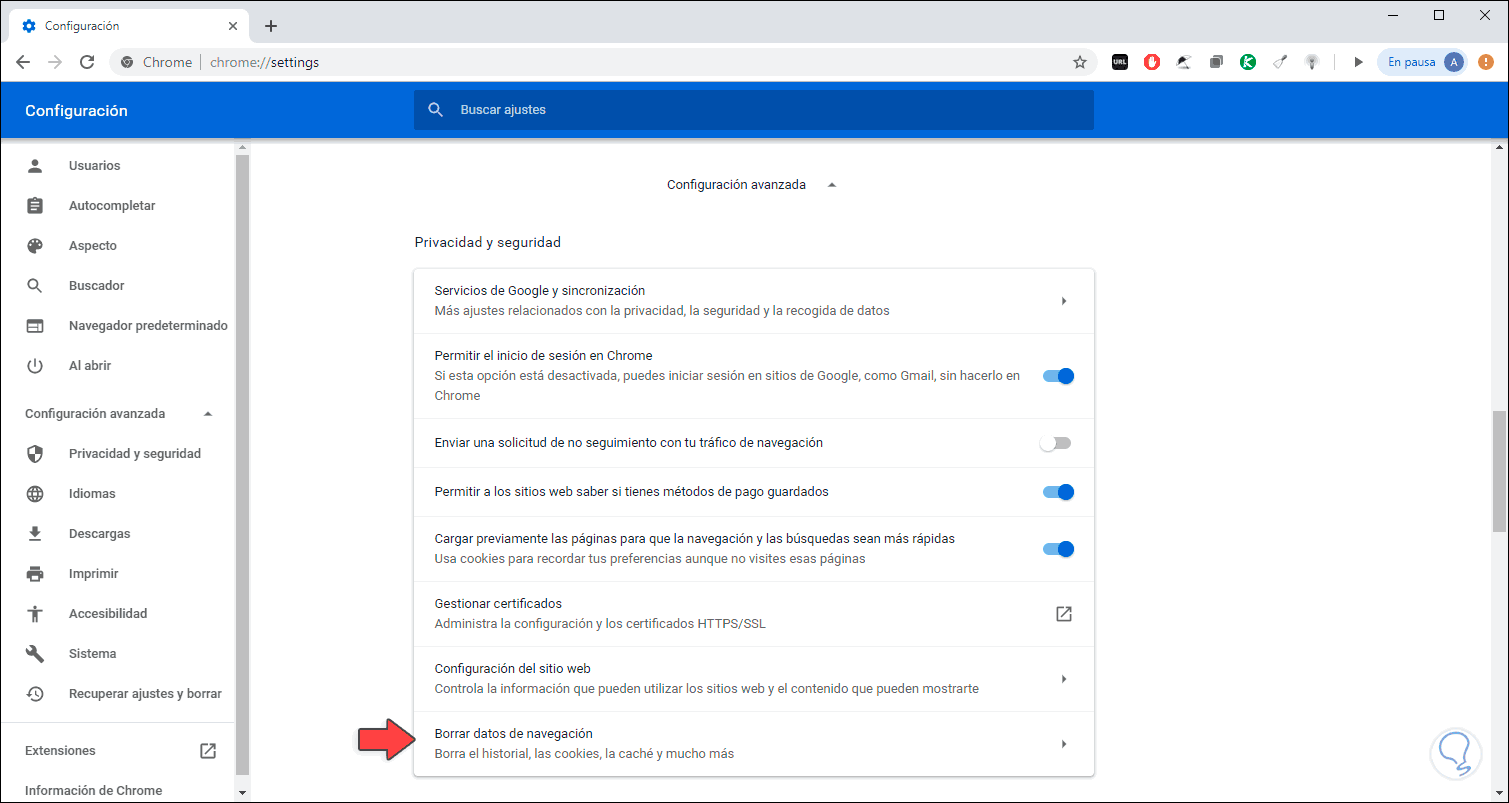 Allí vamos a la sección “Privacidad y seguridad” y damos clic sobre la opción “Borrar datos de navegación”: