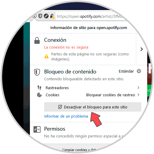 En el caso de usar Firefox Quantum debemos acceder al reproductor web y allí dar clic sobre el icono “Mostrar información del sitio” y en las opciones desplegadas dar clic sobre el botón “Desactivar el bloqueo para este sitio”: