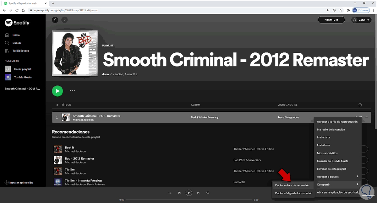 Si podemos acceder de forma normal al reproductor y navegar entre las listas, pero al momento de reproducir la canción esta no suena podemos hacer lo siguiente, pasamos el mouse sobre la canción y allí se desplegarán tres puntos verticales, damos clic en ellos y seleccionamos la opción “Copy song link”: