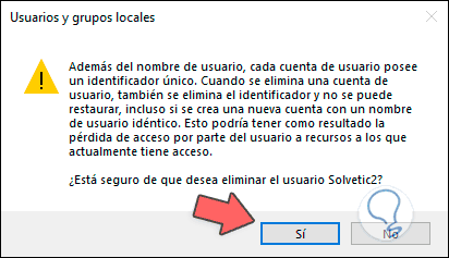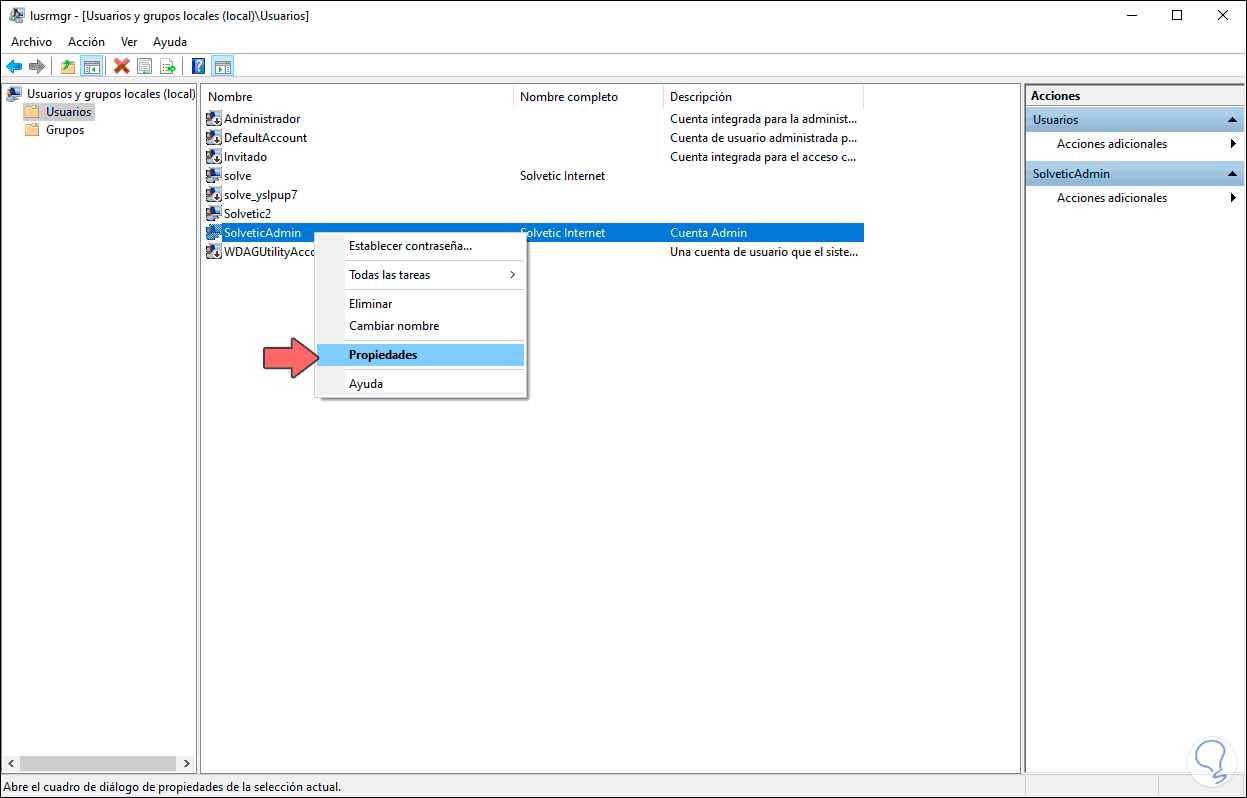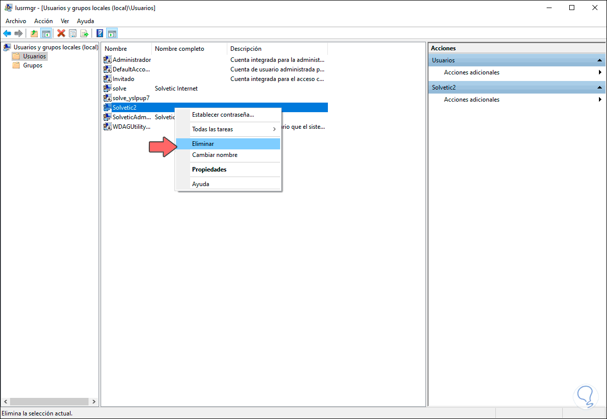Hemos mencionado al inicio que la cuenta integrada Administrador no puede ser eliminada del sistema, pero si podemos remover las cuentas locales que han sido definidas como administradores, para ello ejecutamos de nuevo el comando lusrmgr.msc y en la sección Usuarios damos clic derecho sobre el usuario deseado y seleccionamos “Eliminar”: