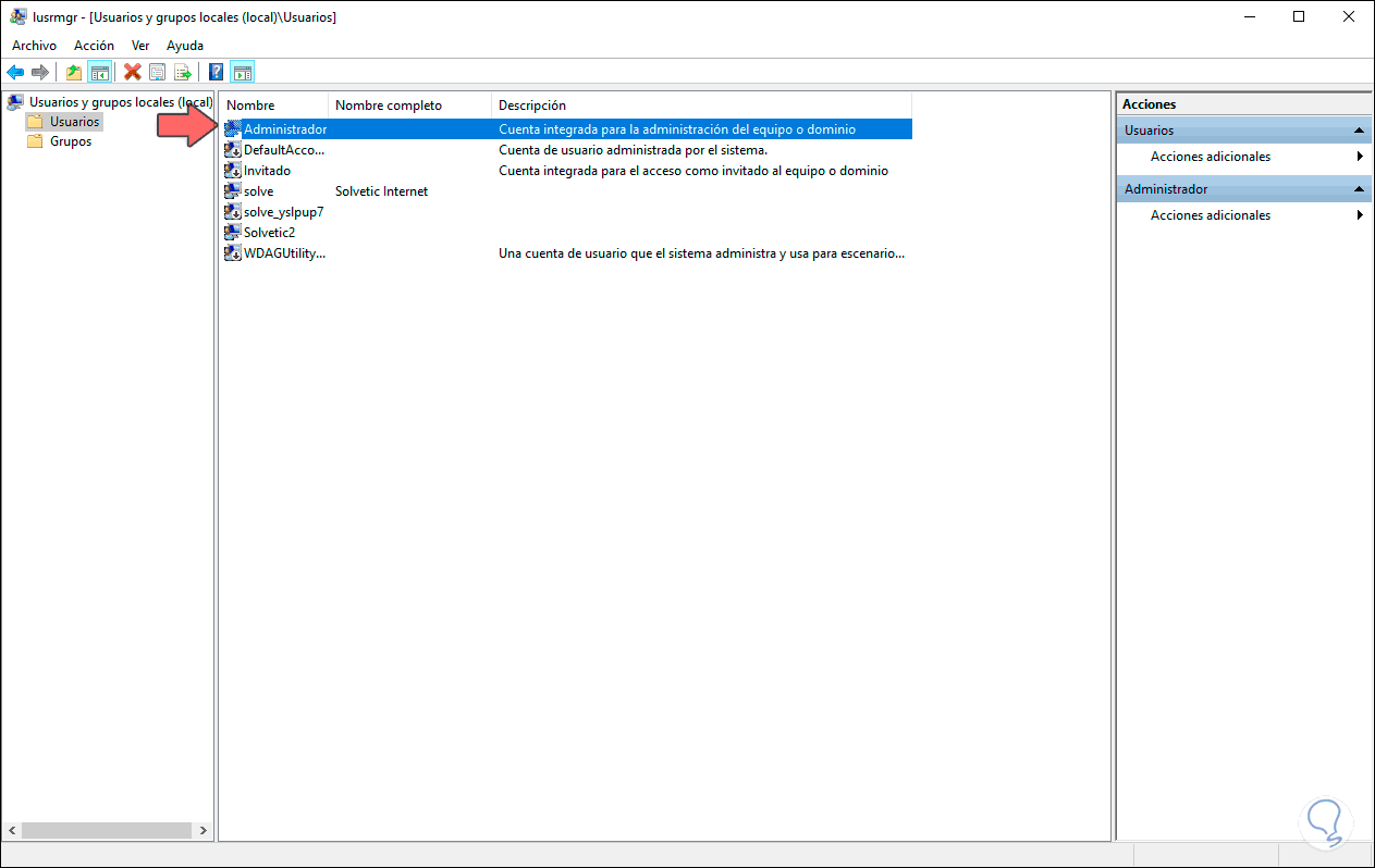 En la ventana desplegada iremos a la carpeta “Usuarios” y ubicamos en el panel central el usuario “Administrador”: