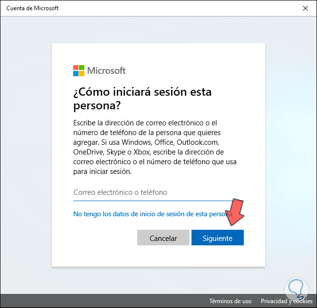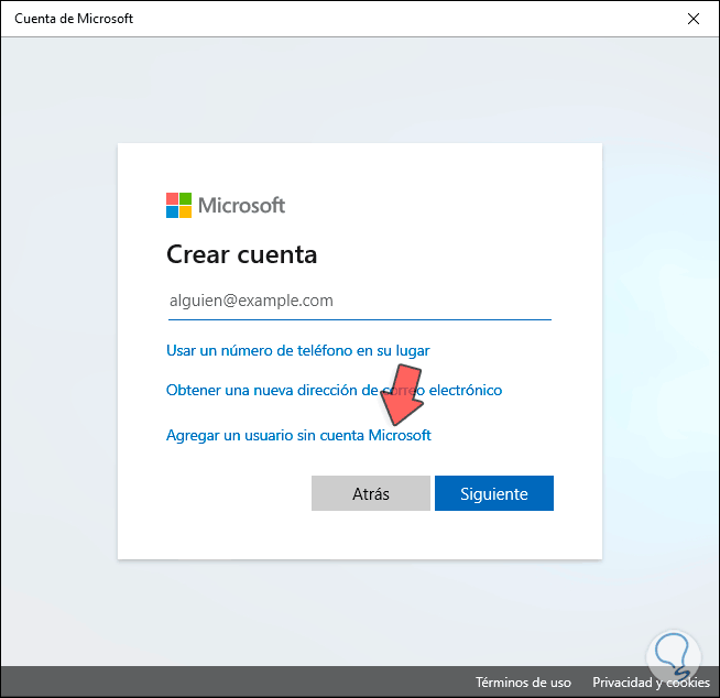 Luego seleccionamos “Agregar un usuario sin cuenta Microsoft”: