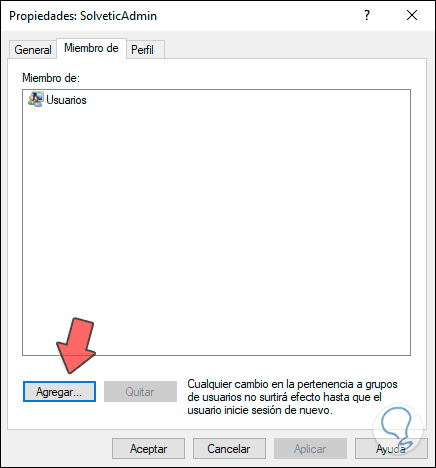 En la ventana desplegada iremos a la pestaña “Miembro de” donde veremos lo siguiente: