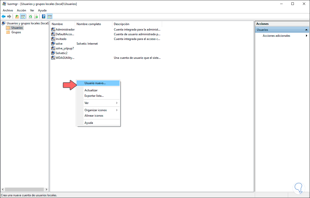 Esto permite que creemos una cuenta local asignándole el grupo de Administradores para temas de permisos, para ello de nuevo ejecutamos el comando lusrmgr.msc y en la ventana desplegada iremos a “Usuarios” y allí damos clic derecho en algún lugar libre y seleccionamos “Usuario nuevo”: