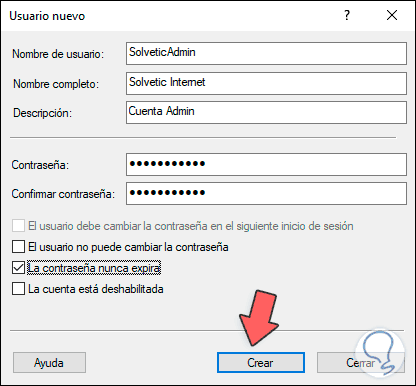 Damos doble clic sobre dicho usuario y en la ventana desplegada debemos desactivar la casilla “La cuenta esta deshabilitada”. Pulsamos en Aplicar y Aceptar para guardar los cambios y allí es posible evitar que la contraseña expire o que el usuario no pueda editar la misma.