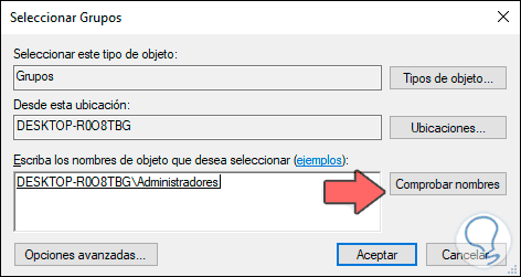 Damos clic en “Agregar” y en la ventana emergente ingresamos “administradores” y pulsamos en “Comprobar nombres” para asociar el grupo “Administradores”: