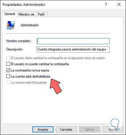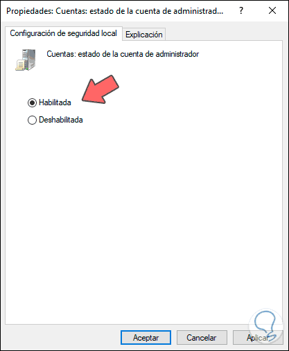 Pulsamos en Aplicar y Aceptar para guardar los cambios y notaremos que la cuenta Administrador ha pasado a ser activa: