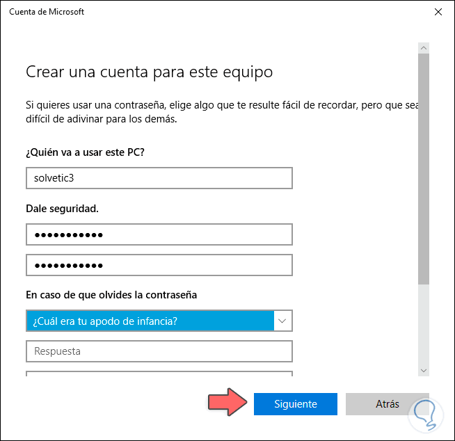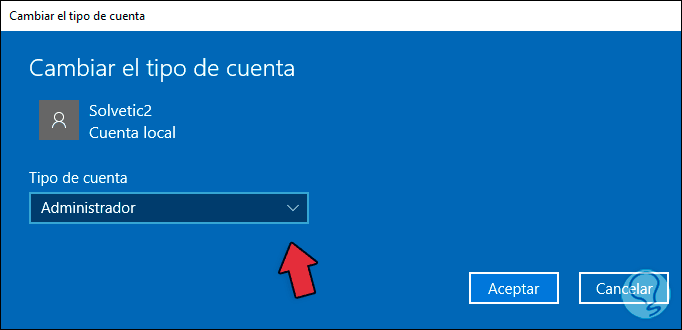 Pulsamos en Siguiente y esta cuenta se creará por defecto como cuenta local. Allí debemos seleccionar la cuenta y cambiar el tipo de la misma como hemos visto.
