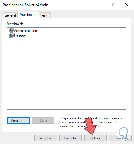 Pulsamos en Aceptar y veremos que se ha integrado el grupo. Damos clic en Aplicar y Aceptar para guardar los cambios.