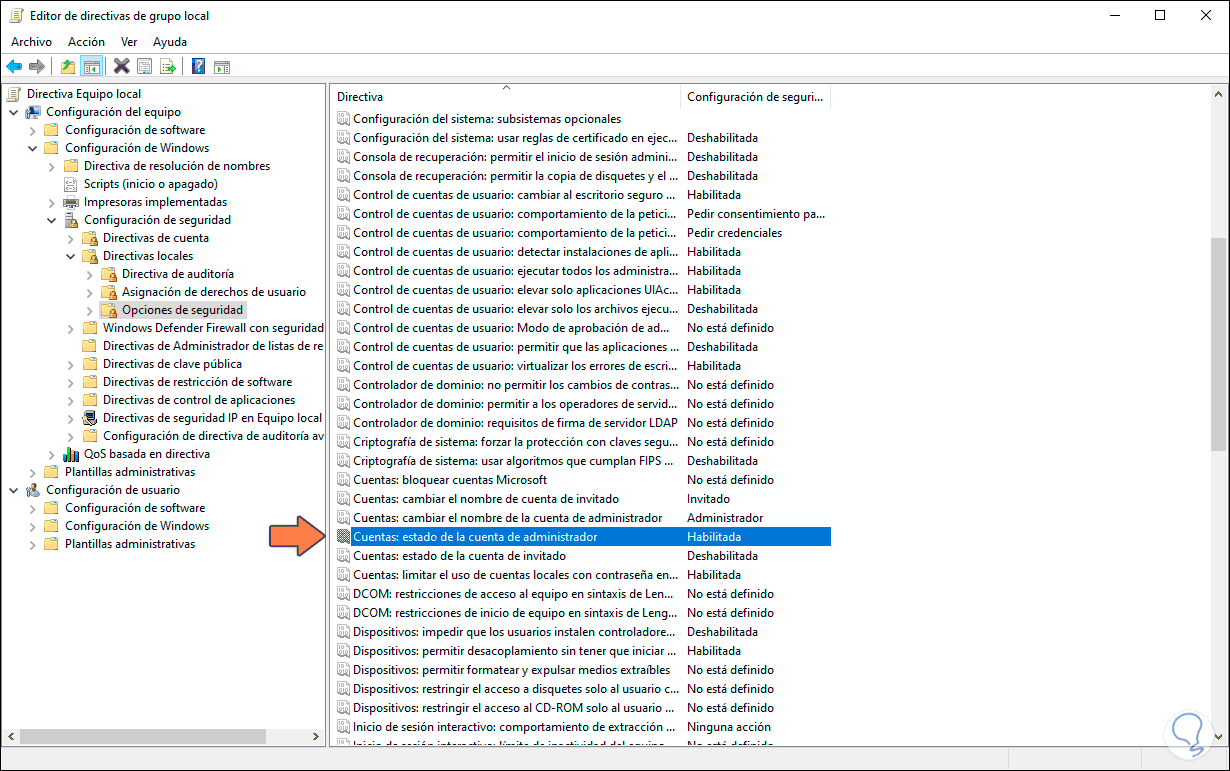 En el panel central ubicaremos la política llamada “Cuentas: estado de la cuenta administrador”: