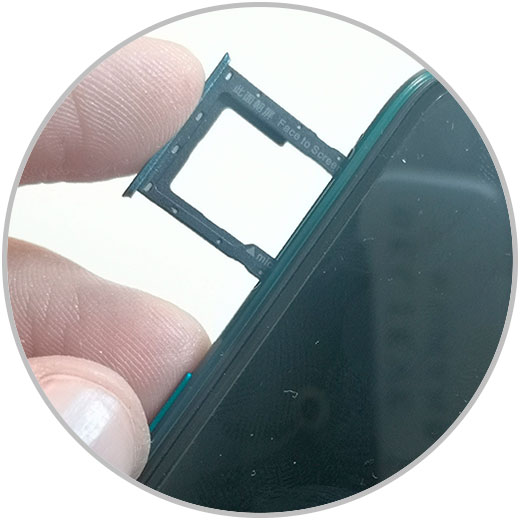 Aquí encontrarás 3 huecos, el de la izquierda para la Micro SD, el central para la SIM secundaria y el de la derecha para la SIM principal o SIM 1. Coloca la Nano SIM en este hueco.