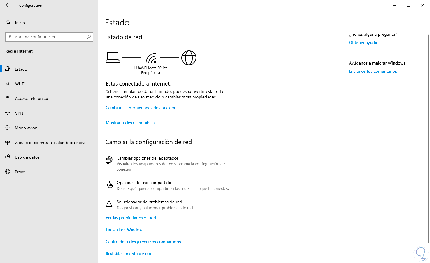 Seleccionamos la categoría “Red e Internet” y en la próxima ventana iremos a “Estado” donde comprobamos el nivel de la señal: