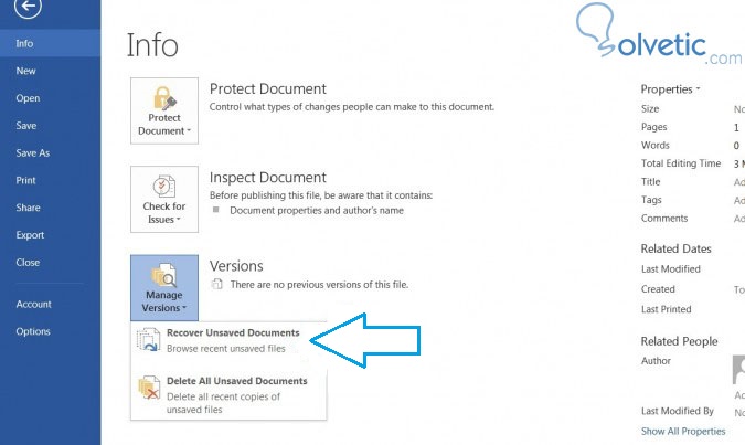 3- En la parte inferior en la sección de versiones, hacemos click en Gestionar Versiones, allí se desplegará un pequeño menú y seleccionaremos Recuperar Documentos sin Guardar: