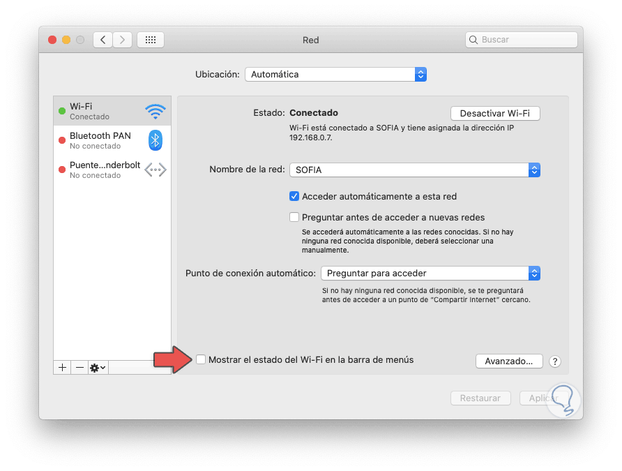 Si por algún motivo deseamos que el icono de Wi-Fi no esté visible en macOS, debemos ir a la ruta mencionada anteriormente y allí desactivar la casilla “Mostrar el estado del Wi-Fi en la barra de menús”:
