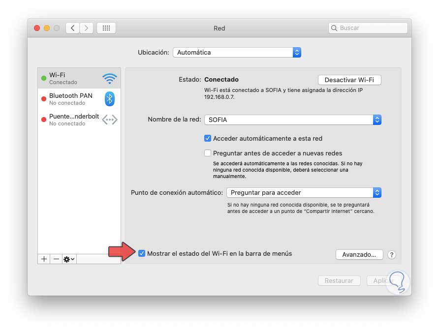 Allí seleccionamos la categoría “Red” y en la siguiente ventana seleccionamos la sección “Wi-FI” en donde veremos lo siguiente. Para desplegar el icono de la red Wi-Fi debemos activar la casilla “Mostrar el estado del Wi-Fi en la barra de menús”.