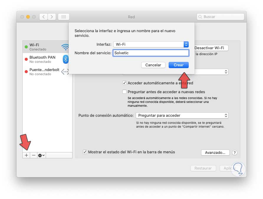 Como un punto adicional, si no ves la sección Wi-Fi en el panel lateral de Red debes dar clic en el signo + ubicado en la parte inferior y en la ventana emergente seleccionar “Wi-Fi” en el campo Interfaz y asignar el nombre deseado. Damos clic en Crear y posteriormente permitimos que sea visible en la barra de menús.