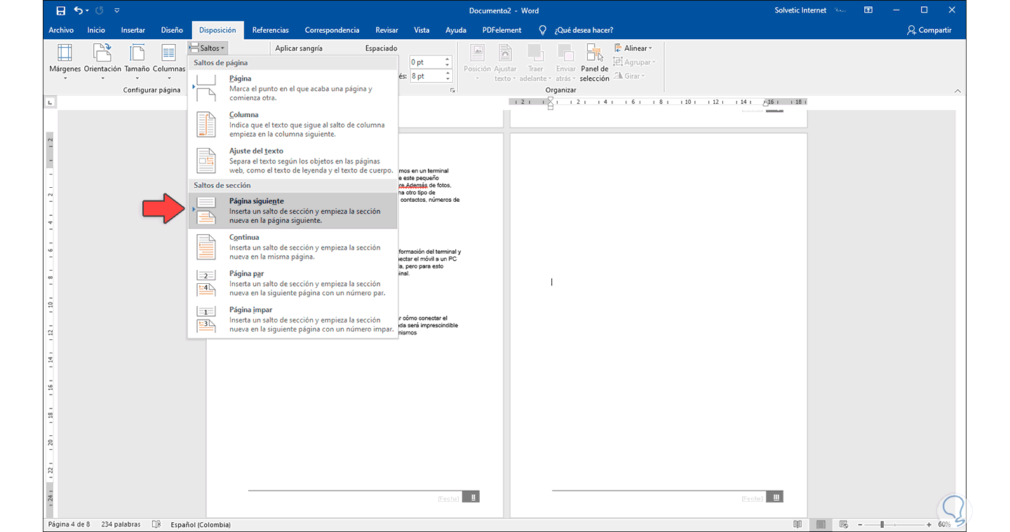 Ahora ha llegado el momento de editar estos valores, para ello ubicamos el cursor en la última palabra de la primera hoja e iremos al menú “Disposición” y en el grupo “Configurar página” damos clic en la opción “Saltos” y allí seleccionamos “Página siguiente”: