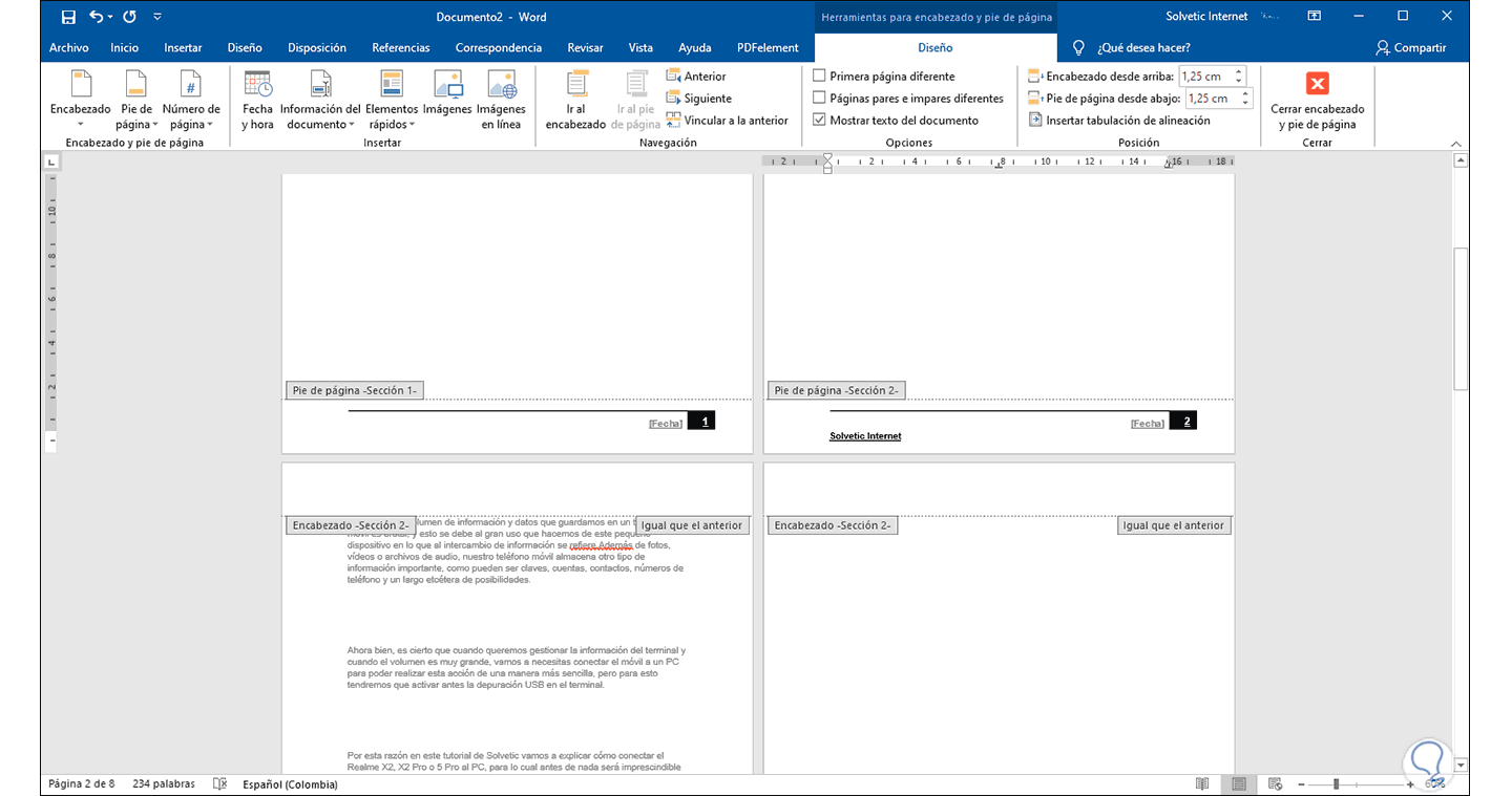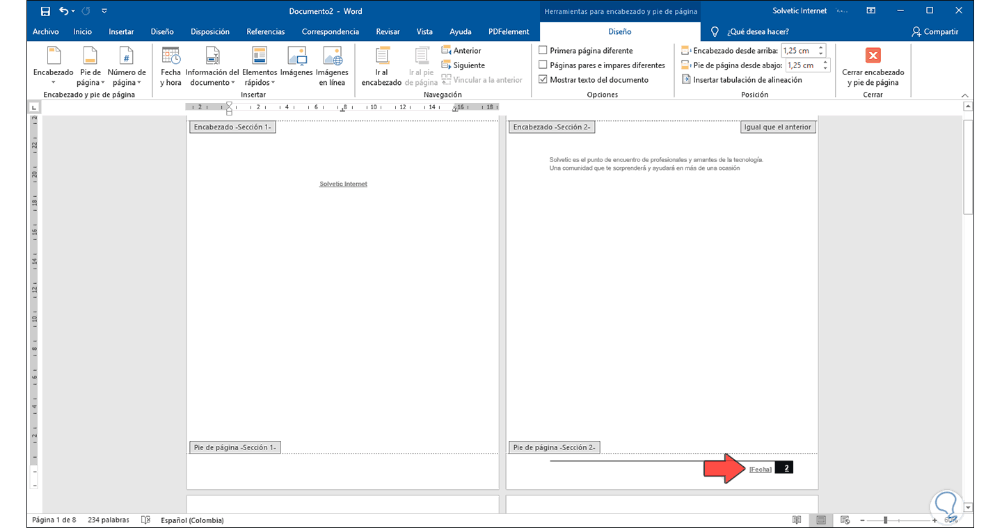 Comprobamos que la sección ha sido aplicada de forma correcta dando doble clic sobre el pie de página y allí veremos la leyenda Pie de página sección 1, 2 etc. Es de anotar que solo la página uno tiene la leyenda Sección uno, las demás páginas dirán Sección 2.