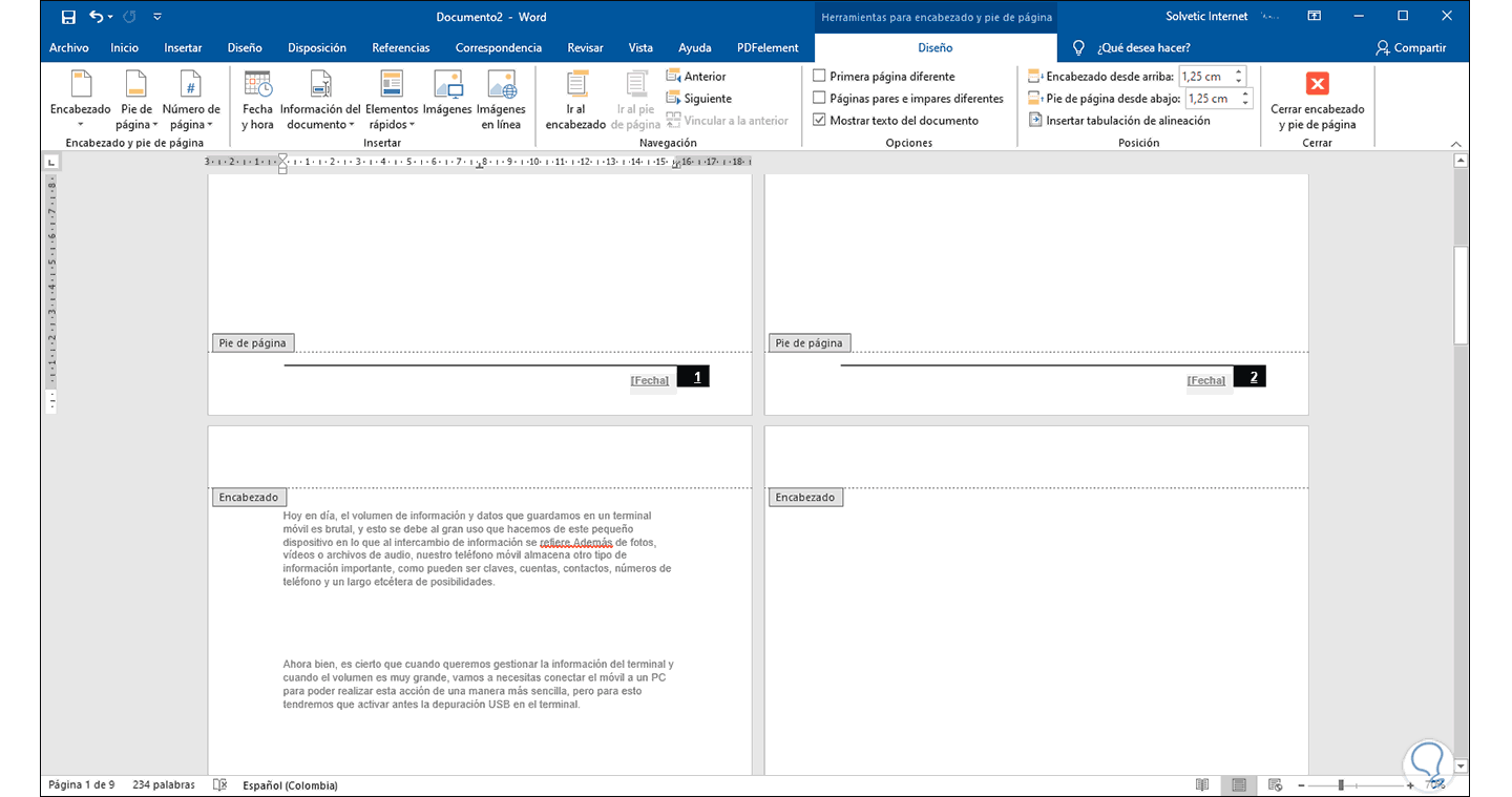 Definido esto podemos borrar el esquema del pie de página de la primera página en el documento de Word 2019: