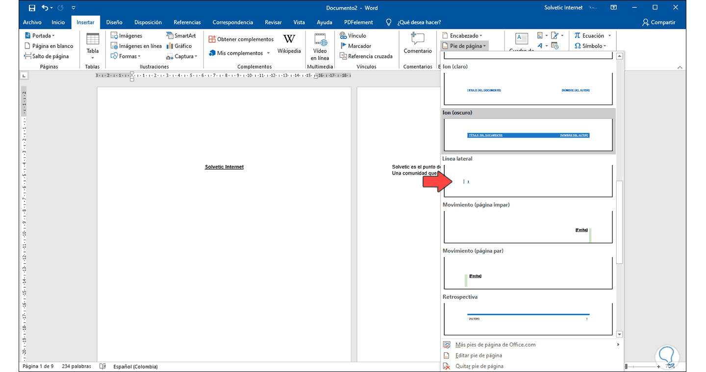 En este caso vamos a insertar la numeración en Word 2019 desde el pie de página mas no en el encabezado. Para ello iremos al menú Insertar y en el grupo Encabezado y pie de página damos clic sobre “Pie de página” para seleccionar el diseño deseado: