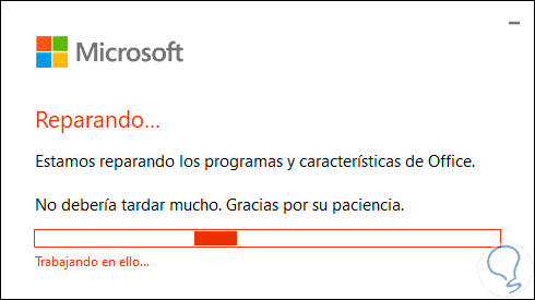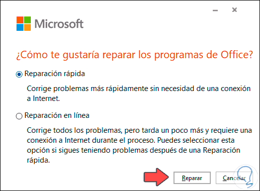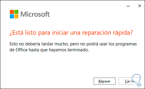 Allí podremos usar una reparación rápida la cual se hace de forma local en búsqueda de fallos en los procesos o bien recurrir a una reparación en línea la cual debe establecer una conexión con los servidores de Microsoft y posteriormente aplicar los correctivos, para este caso seleccionamos “Reparación rápida”, damos clic en el botón “Reparar” y será desplegado lo siguiente: