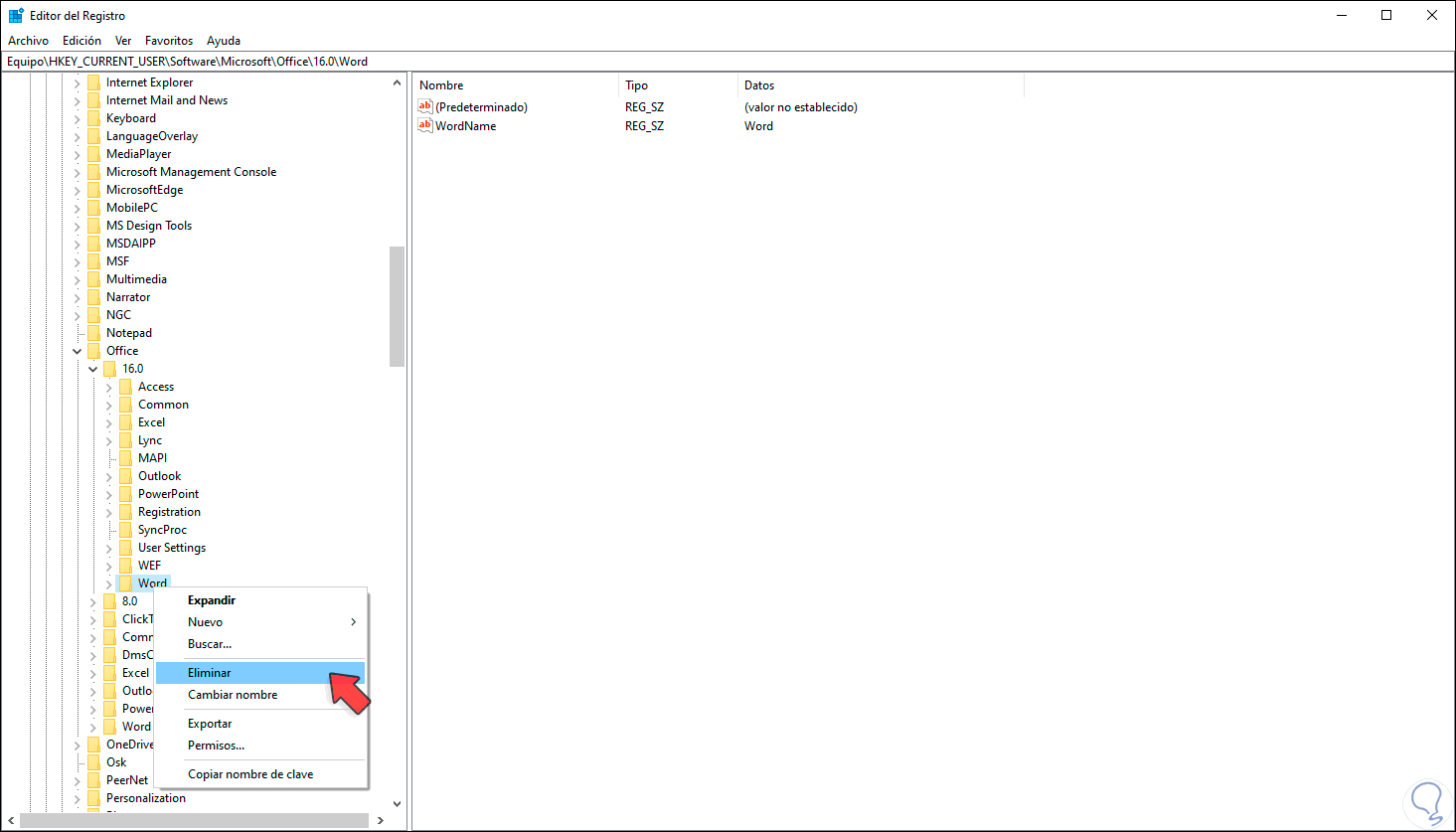 Allí seleccionamos la clave Word, damos clic derecho sobre ella y seleccionamos la opción “Eliminar”: