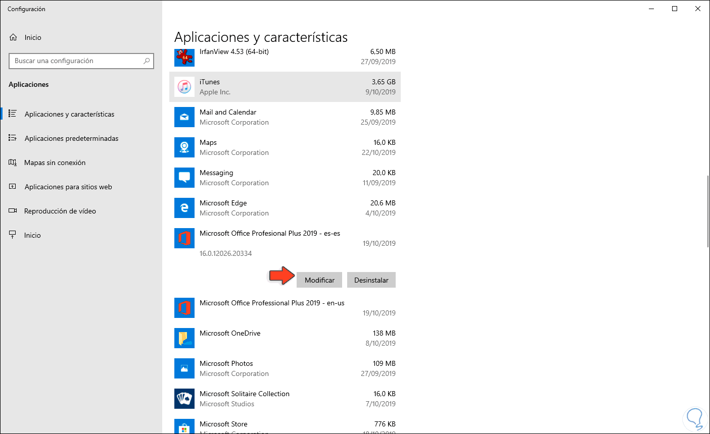 Seleccionamos la categoría “Aplicaciones” y en la siguiente ventana vamos a “Aplicaciones y características” y ubicaremos la suite de Office instalada, la seleccionamos y se desplegará el botón “Modificar”: