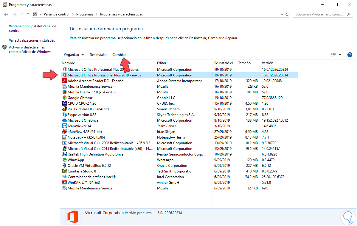Allí debemos ubicar la instalación de Office (2016 / 2019) y seleccionarla: