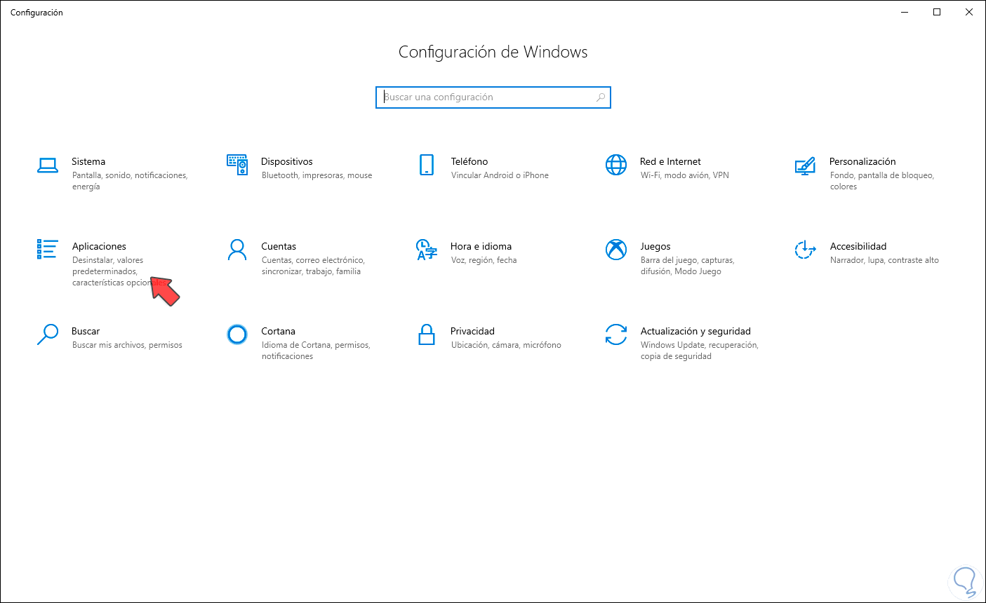 Este es otro método disponible para restaurar Microsoft Word, para ello vamos al menú Inicio y allí seleccionamos la utilidad Configuración y se desplegará lo siguiente:
