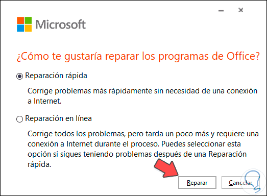 Esta es una de las soluciones integradas para Windows 10 ya que esta nos permite reparar la instalación de Office actual en el equipo