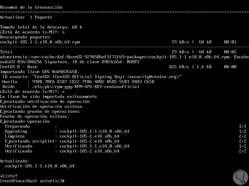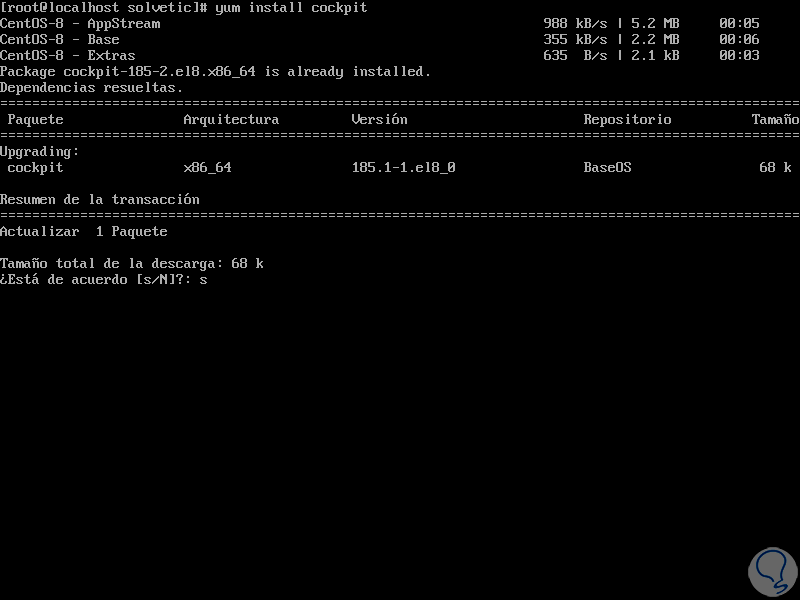 Nuevamente ingresamos la letra “s” y finalmente hemos instalado Cockpit en CentOS 8: