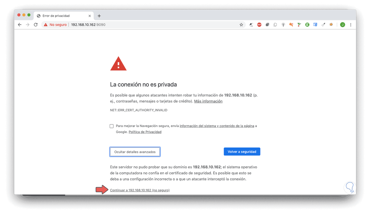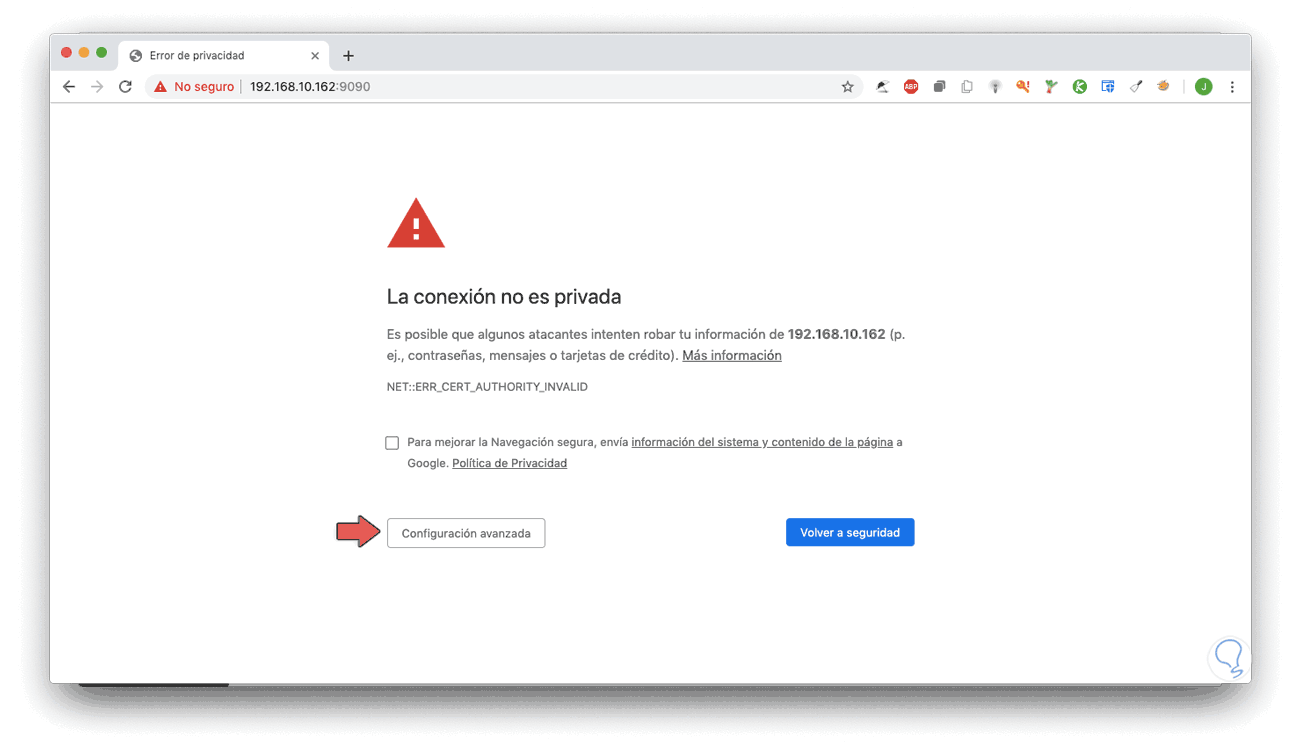 es un tema de seguridad, para acceder damos clic en el botón “Configuración avanzada” y luego damos clic sobre la línea “Continuar a 192.168.xxx.xxx”: