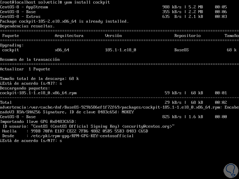 Ingresamos la letra “s” para confirmar la descarga e instalar Cockpit en CentOS 8 y luego de ello debemos aceptar la importación de la clave GPG:
