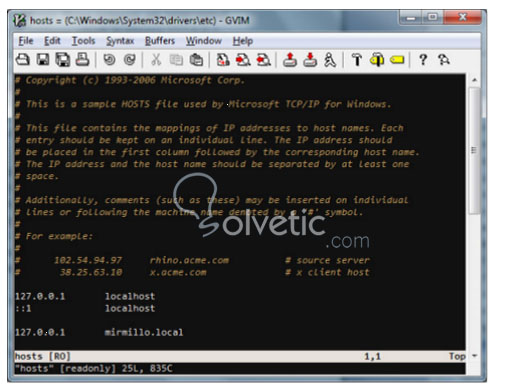 Ahora que esto está hecho debemos modificar por fin nuestro archivo host del sistema operativo de forma que cuando llamemos por navegador al dominio creado lo resuelva hacia la ip de nuestro local, en Windows este archivo lo podemos encontrar en la ruta C:\Windows\System32\drivers\etc, en Mac lo podemos ver en la ruta /private/etc/hosts y en Linux usualmente está en la ruta /etc/hosts, esto es algo bastante sencillo de hacer como podemos ver en la siguiente imagen: