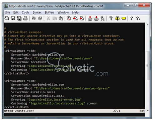 Debemos ubicar el archivo host de nuestro sistema operativo y hacer que resuelva la dirección hacia nuestro local que tiene como ip el 127.0.0.1, aquí podremos crear tantos dominios para tantas instalaciones que tengamos y las cuales deseemos acceder utilizando este sistema, para esto ya debemos de haber configurado nuestro apache para que acepte la utilización del virtual host, que no es más que una directiva del servidor en el cual se especifica que para una dirección en particular el servidor va a resolver hacia una carpeta, como podemos ver en la siguiente imágen:
