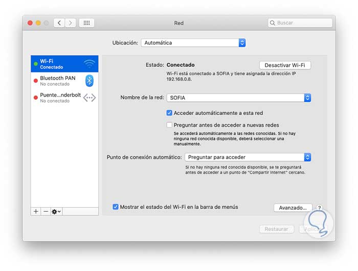 En el caso de usar macOS, si deseas conocer la IP del equipo debes ir a Preferencias del sistema / Red y allí seleccionar el tipo de conexión para acceder a estos detalles: