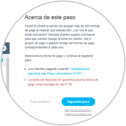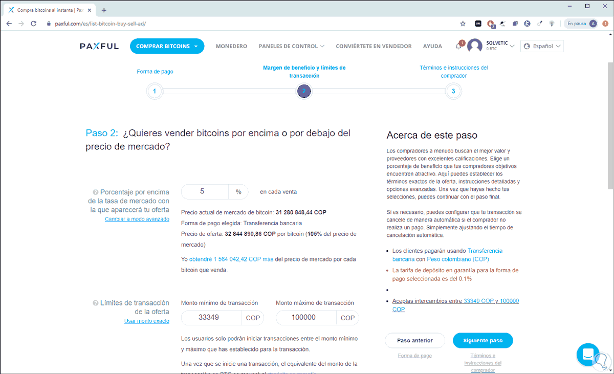 Una vez definamos qué tipo de pago se dará, damos clic en Siguiente paso y allí definiremos los límites mínimos y máximo de venta de Bitcoin: