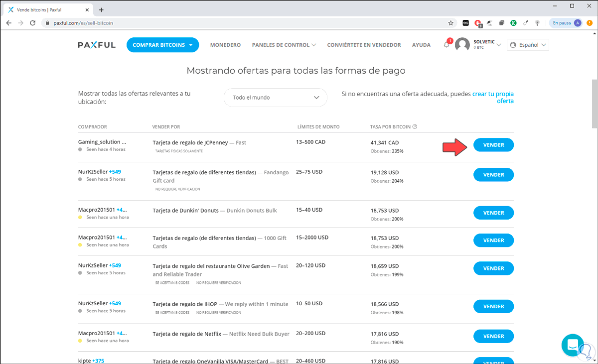 Allí podemos definir la forma en que recibiremos el pago, así como la filtrar la cantidad y en la parte inferior podemos ver la demanda de compradores. También veremos cómo revisar el porcentaje de ganancia con cada uno de ellos. Allí damos clic en “Vender” y seguimos los pasos del asistente.