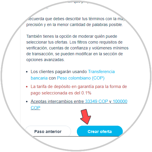 Después de esto ingresaremos los términos de la oferta. Allí damos clic en “Crear oferta” para proceder.