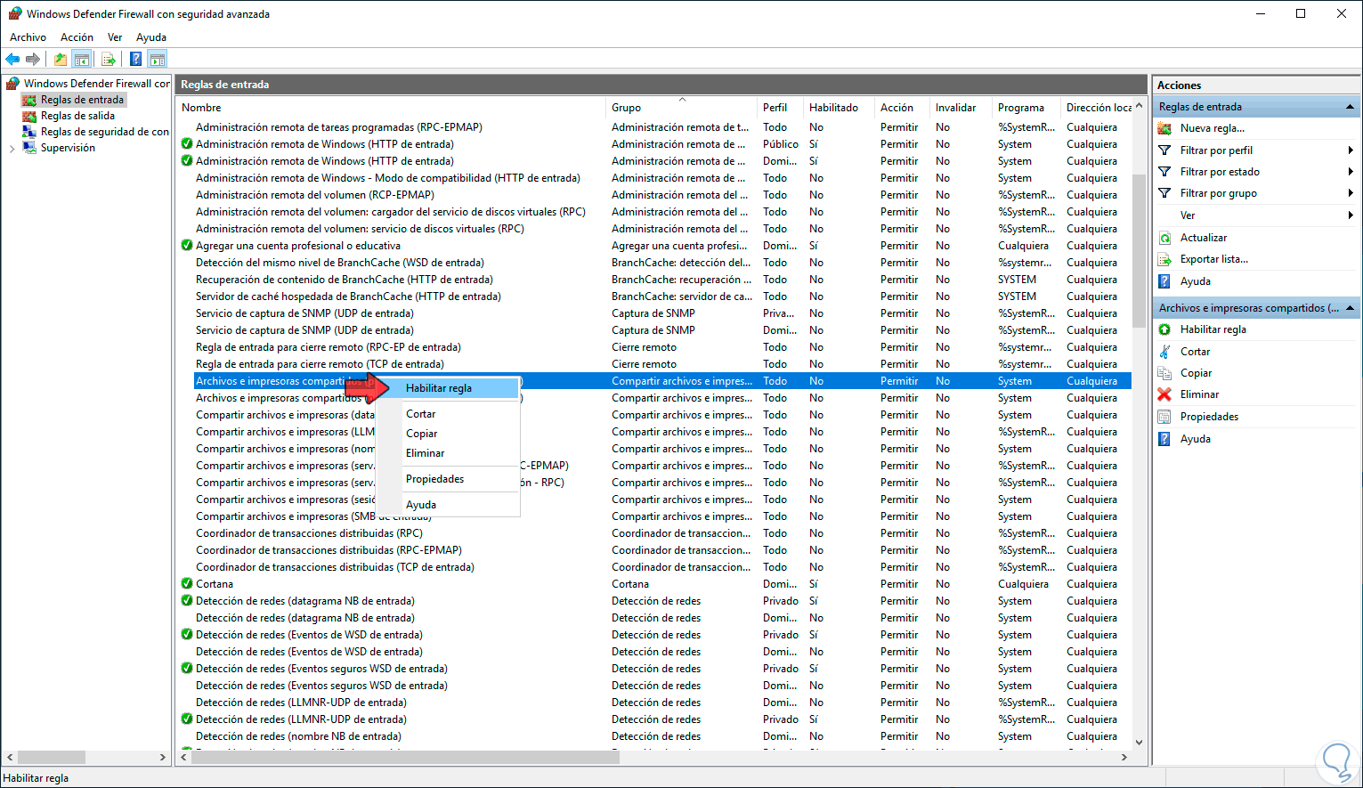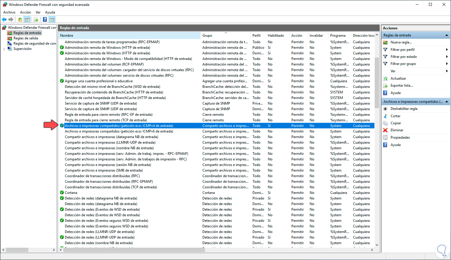 Allí damos clic en la línea “Configuración avanzada” y en la ventana que será desplegada vamos a la sección “Reglas de entrada” y allí ubicaremos la regla llamada “Archivos e impresoras compartidos (petición eco: ICMPv4 de entrada)”, damos clic derecho sobre ella y seleccionamos la opción “Habilitar regla”: